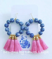 Chinoiserie Beaded Tassel Hoop Earrings - Hot Pink or Light Pink