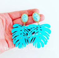 Monstera Tropical Palm Leaf Statement Earrings - Turquoise & Gold Cameo