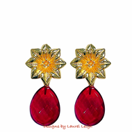 Gold Floral Red Gemstone Drop Earrings