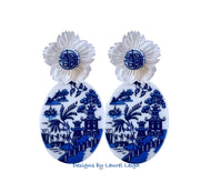 Blue Willow Pearl Chinoiserie Flower Earrings
